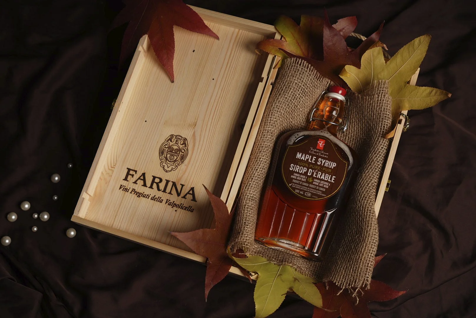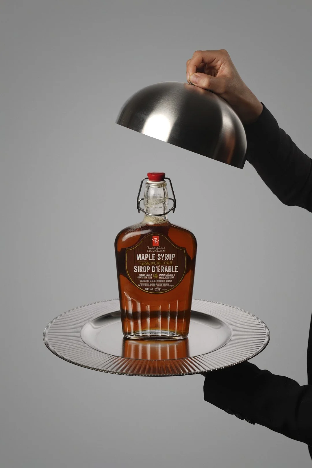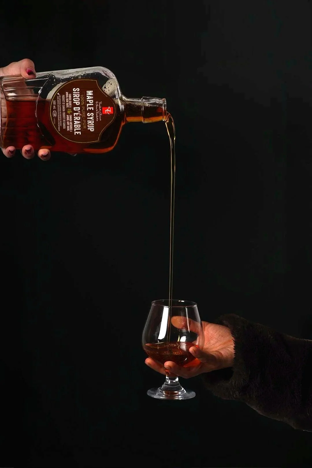 Lighting is warm, cinematic glow with amber highlights that mirror syrup’s natural hue